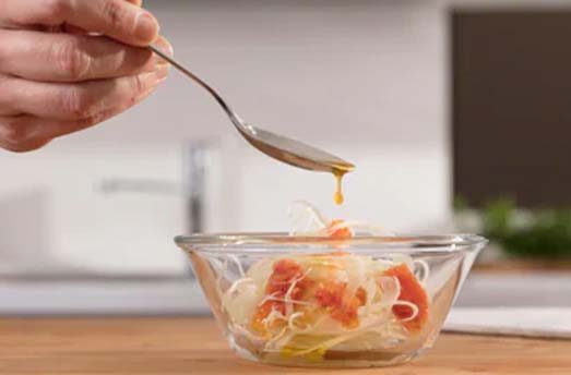 2. Den Salat mit Orangen-Zitronensosse anrichten.
